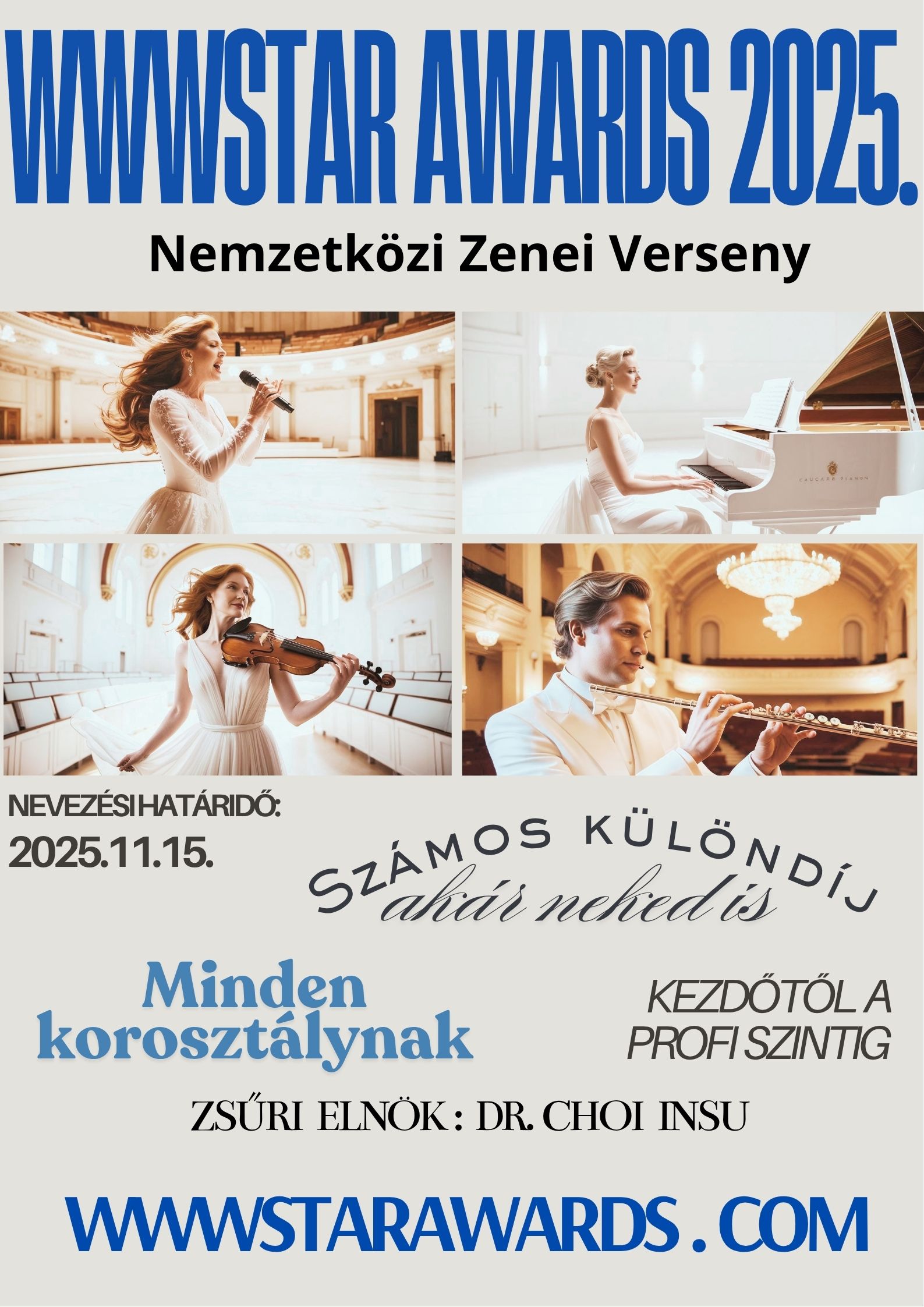 A WWWSTAR Awards Nemzetközi Zenei Verseny immár 9. alkalommal kerül megrendezésre, mely egyedülálló lehetőséget kínál a világ minden tájáról érkező tehetséges zenészek számára, hogy bemutassák művészetüket. A versenyzők előadásait nemzetközileg elismert szakemberekből álló rangos zsűri értékeli.