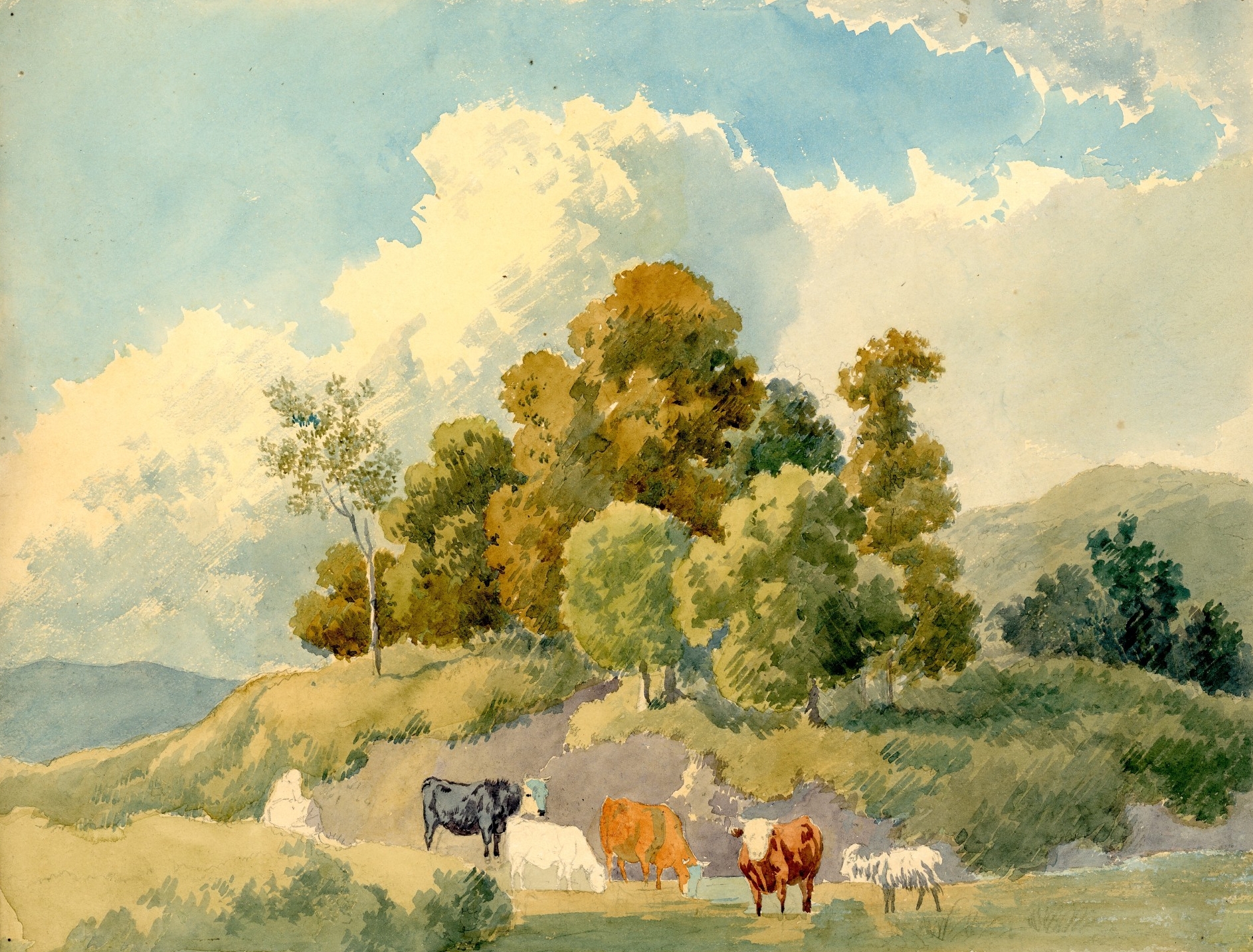 Kép: Julius Hermann Poscharsky (1825-1888): Legelésző csorda (befejezetlen akvarell)